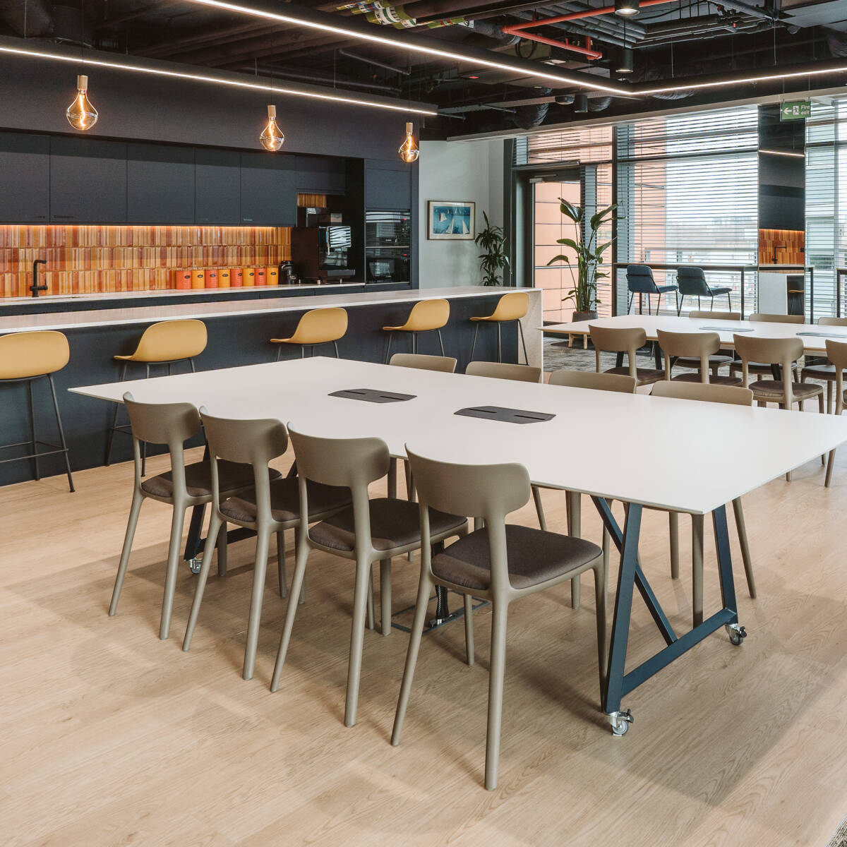 - Espaces Touchdown et Breakout : Connexion Chaises hygge associées aux tables Connection Omni favorisent les interactions informelles et la flexibilité du travail.