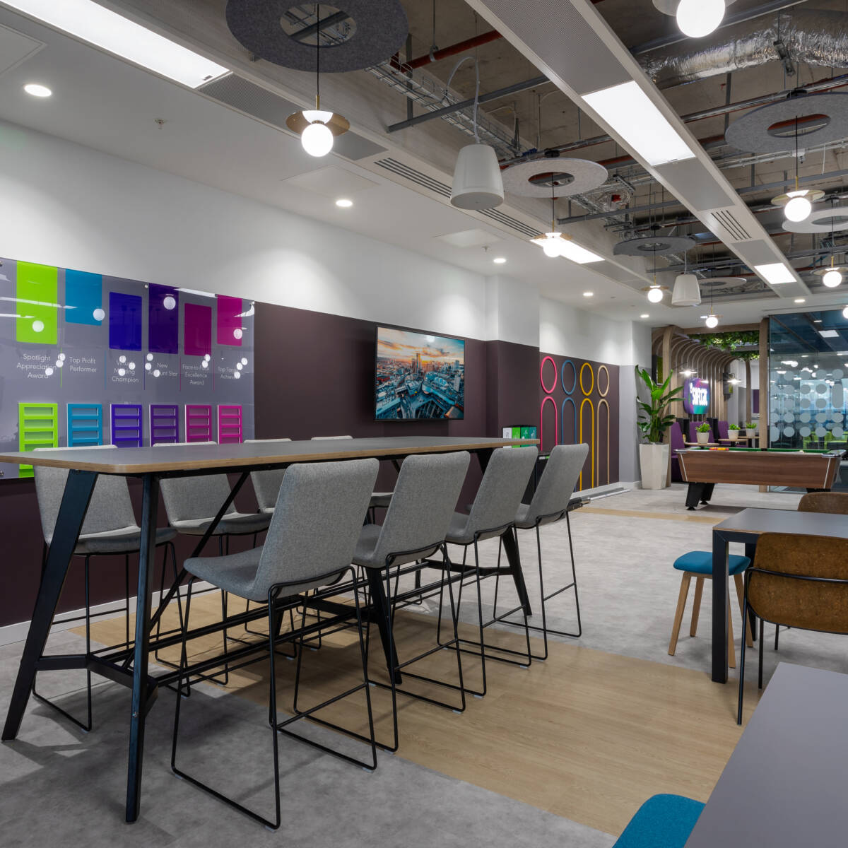 Mobilier, y compris Paulo fauteuils et Tabourets SwooshL'espace de travail, qui a été spécifié dans les couleurs de la marque Softcat, renforce l'identité de la société dans l'ensemble de l'espace.