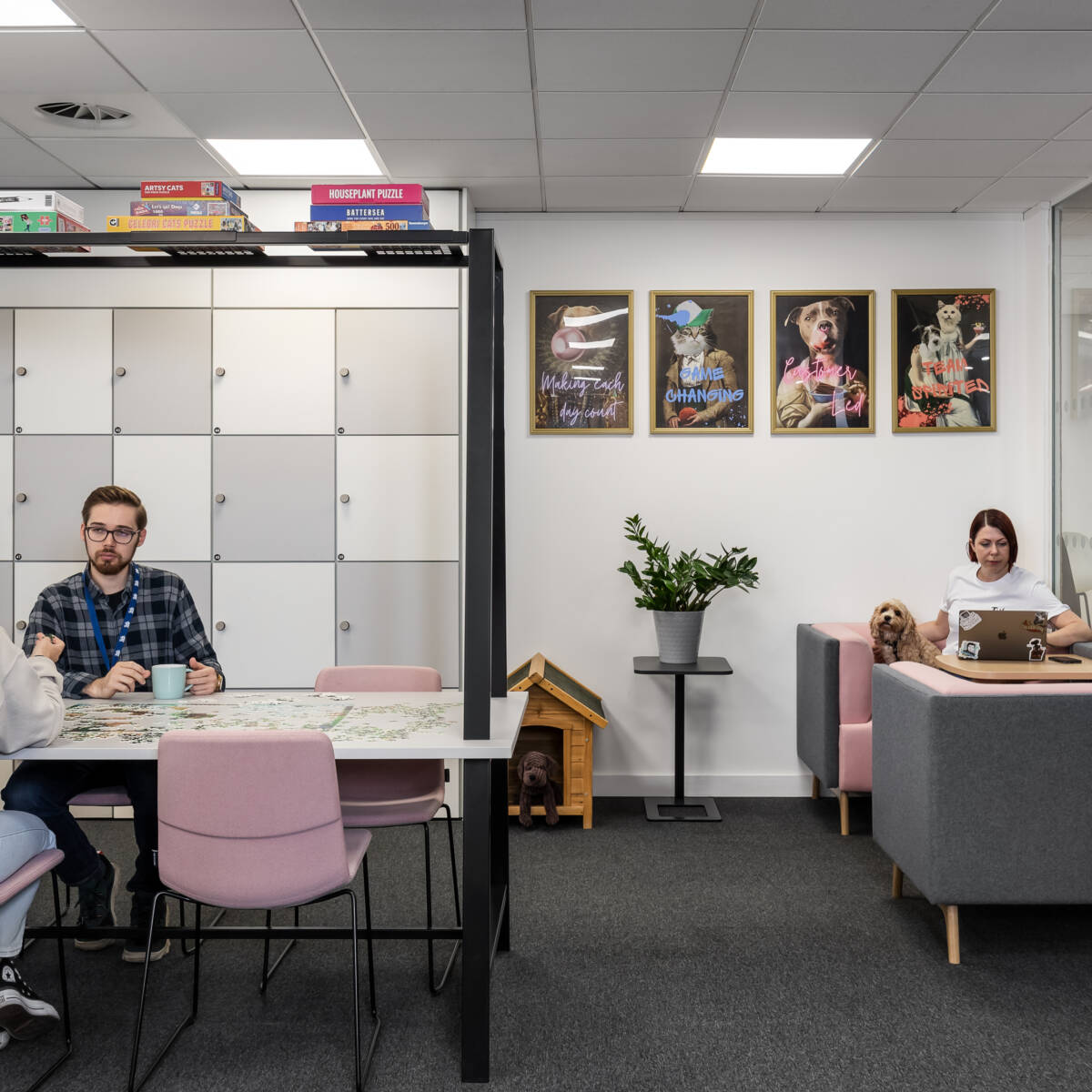Compte tenu des visites fréquentes de chiens dans l'espace de travail, Oktra a mis en œuvre un processus de test rigoureux pour tous les meubles et revêtements de sol. L'équipe de conception a donné la priorité aux matériaux qui sont non seulement durables et résistants aux rayures, mais aussi confortables et esthétiques. Les tissus ont été sélectionnés en consultation avec le client pour assurer la longévité tout en maintenant un environnement coloré et accueillant pour les chiens.