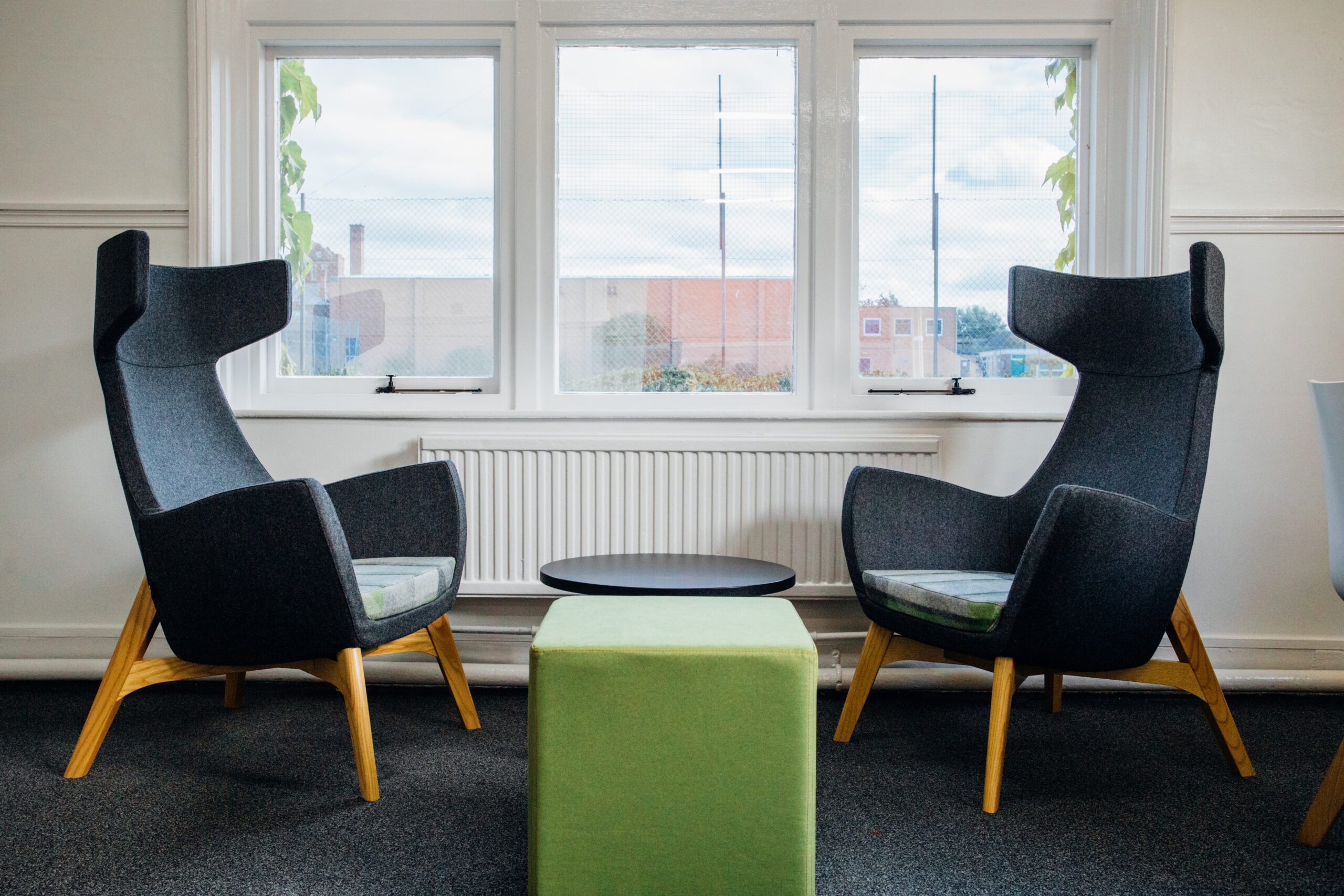 Leo canapés et Kala Des chaises à dossier bas ont été utilisées pour créer des espaces de réunion et de détente informels et accueillants, accompagnés de chaises à dossier bas et de chaises à dossier bas. Dixi tables basses en chêne et Cubix tabourets.