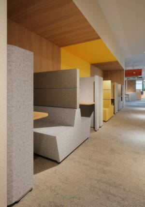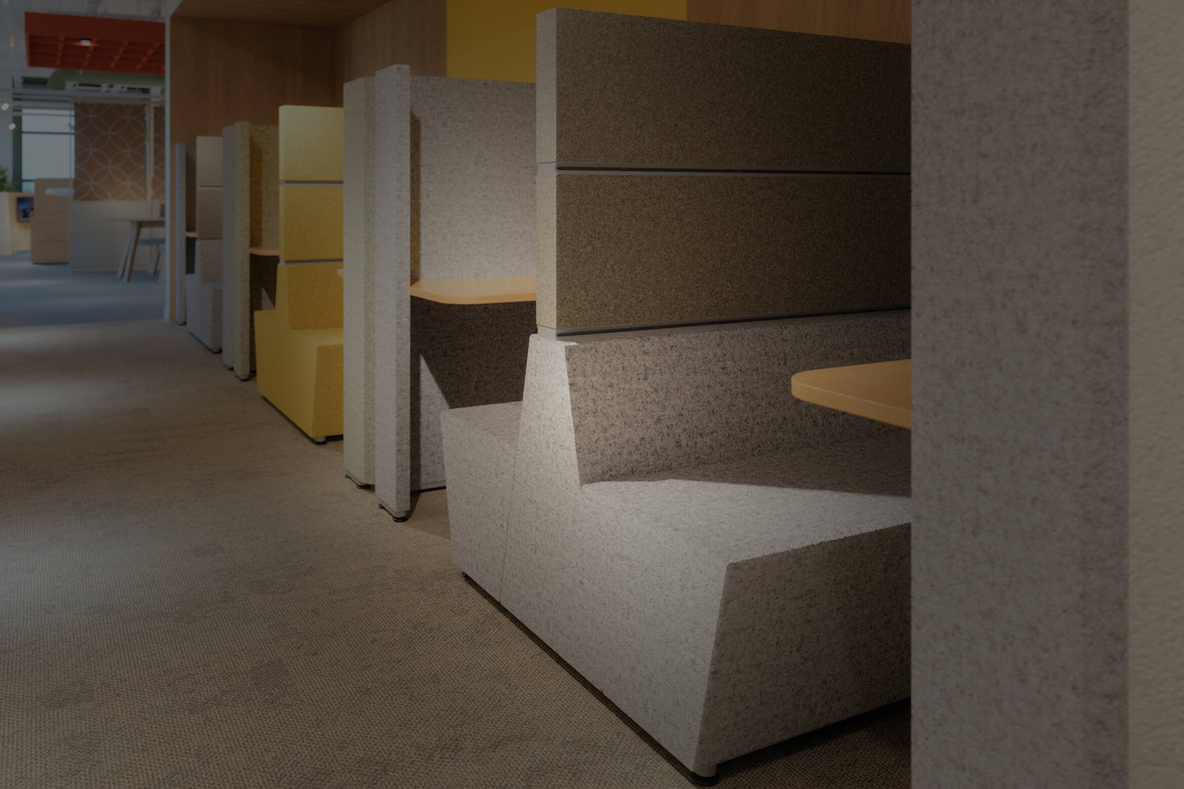A range of free-standing, sound-absorbing enclosures, offering visual privacy and reduced noise levels.
