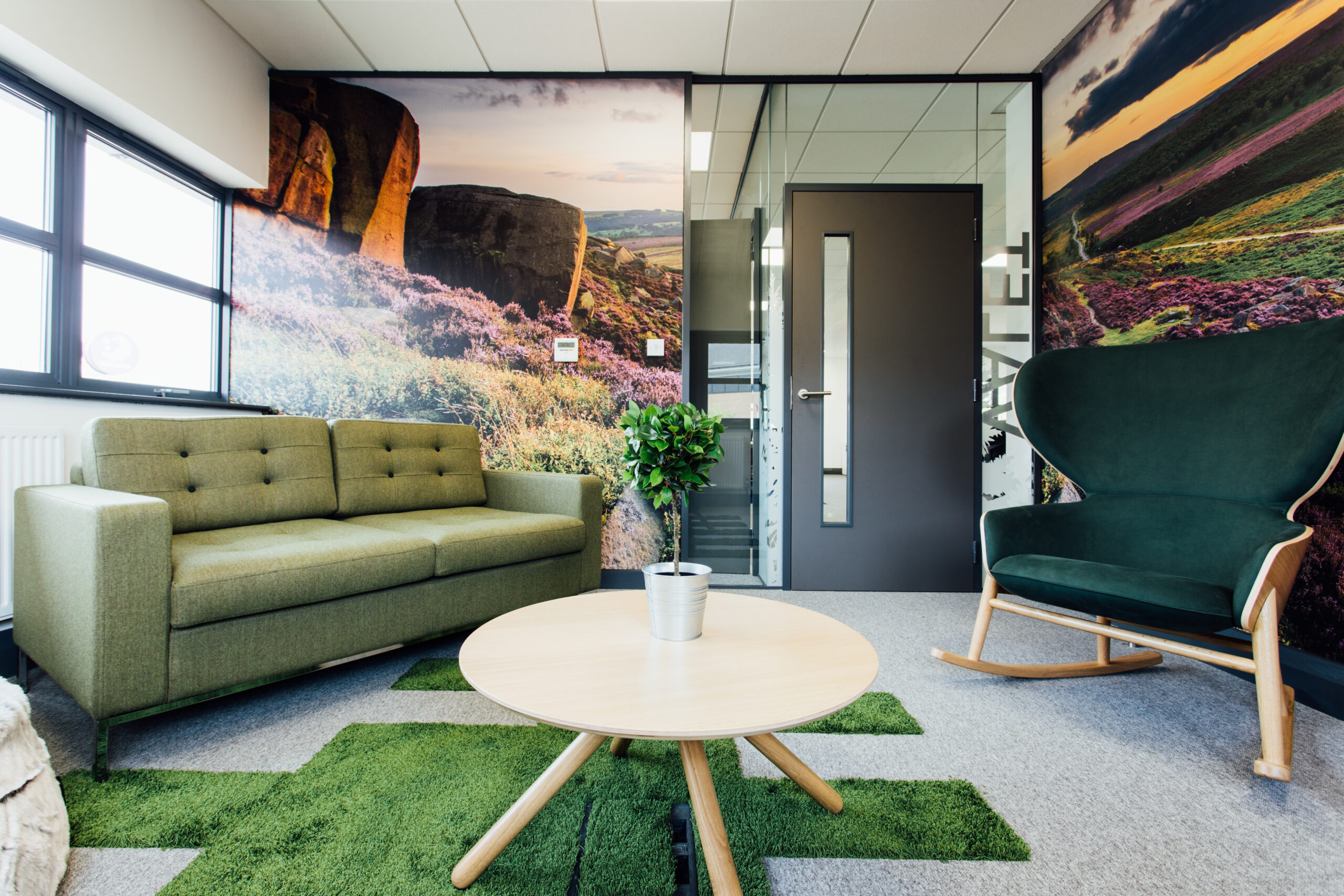 Several meeting rooms were incorporated into the design to provide areas where confidential matters could be discussed. ‘The Valet’ & ‘Boomerang’ rooms featured landscaped wallpaper and autumnal tones to create calming meeting spaces. Hygge rocking chairs and bean bags were specified in one room for an informal meeting vibe and Rollie chairs and tables in another for a more formal meeting space. Dixi tub & high back chairs were specified to create touch down meeting and waiting areas.