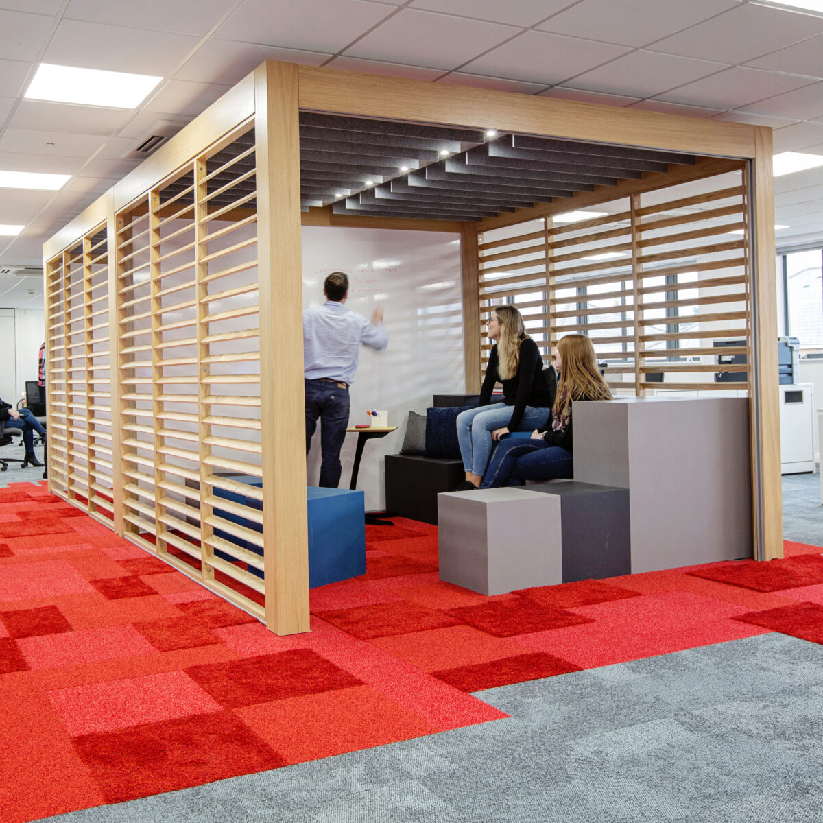 The focal point of the open plan space is Rooms with large whiteboard walls to encourage regular team huddles and inspire an idea sharing culture.